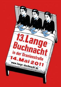 Auf der Website der >>> Langen Buchnacht finden Sie das Programm für die Nacht der Nächte. Es gibt und gab wie in jedem Jahr auch vereinzelte Änderungen. Diese werden soweit möglich online bis zum Stichtag noch aktualisiert. Ein Lese-Ereignis im Rahmen der Langen Buchnacht in der Oranienstraße, Berlin sei hier präsentiert:
