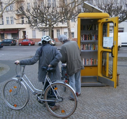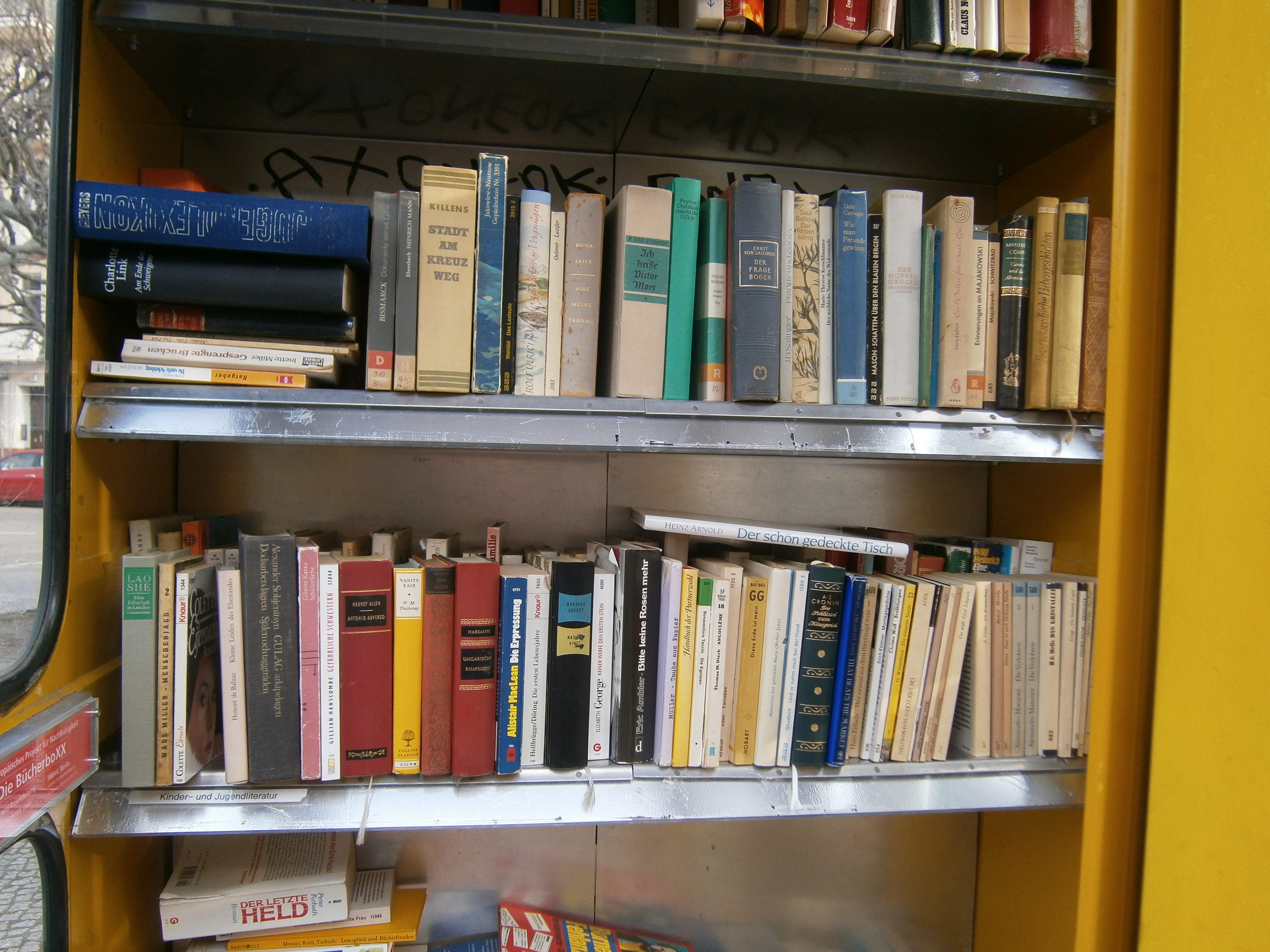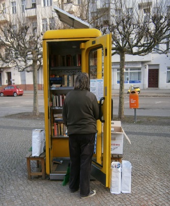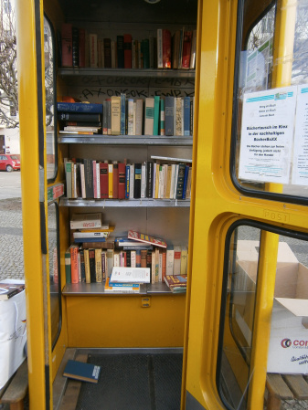 Die Anmerkung sei aber nochmals erlaubt: die BücherboXXen haben das Motto „Nimm ein Buch – Bring ein Buch – Lies ein Buch“. Sie sind kein Antiquariat! Bücher entnommen für unsere ThemenboXXen (Gleis 17; BiblioboXX; das Themenregal am Bebelplatz „Verbrannte Dichter“). Konrad eilt mit Auto herbei und nimmt Bücher mit in unseren kleinen Vorratsraum.