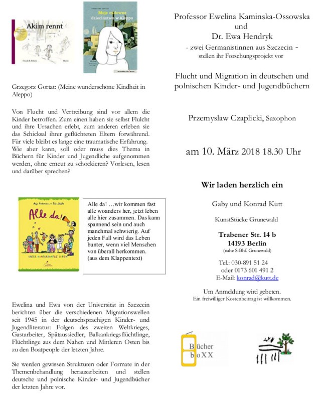 „Flucht und Migration in deutschen und polnischen Kinder- und Jugendbüchern“ ist das Thema eines Salonabends bei KunstStücke Grunewald, zu dem u. a. zwei Professorinnen aus Stettin eingeladen sind.