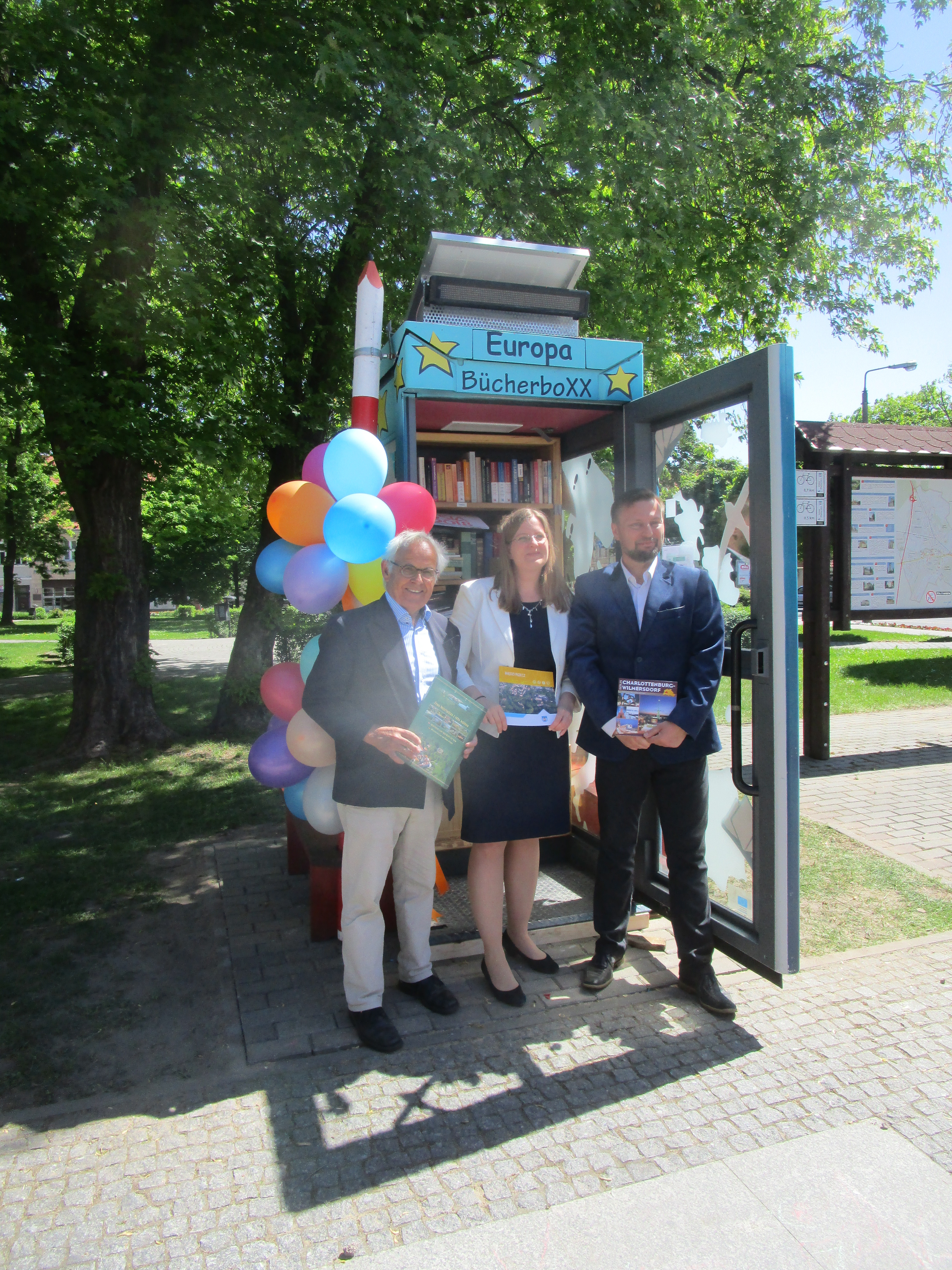 Bürgermeister Remigiusz Lorenz, Stadträtin Heike Schmitt-Schmelz und Konrad Kutt (INBAK) an der BücherboXX in Meseritz (Foto v. r. n. l.)