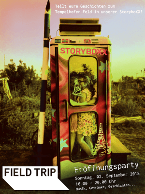 Seit Ende Juli steht sie nun auf dem Tempelhofer Feld: die StoryboXX! Mit einer offiziellen Eröffnungsparty möchten wir uns bei allen bedanken, die den Weg bis hierher mit uns gegangen sind. In ungezwungener Atmosphäre, mit dem Team von Field Trip, Euch und Menschen vom Feld feiern wir einen Nachmittag lang unser Projekt zur Vergangenheit, Gegenwart und Zukunft des Tempelhofer Feldes.
