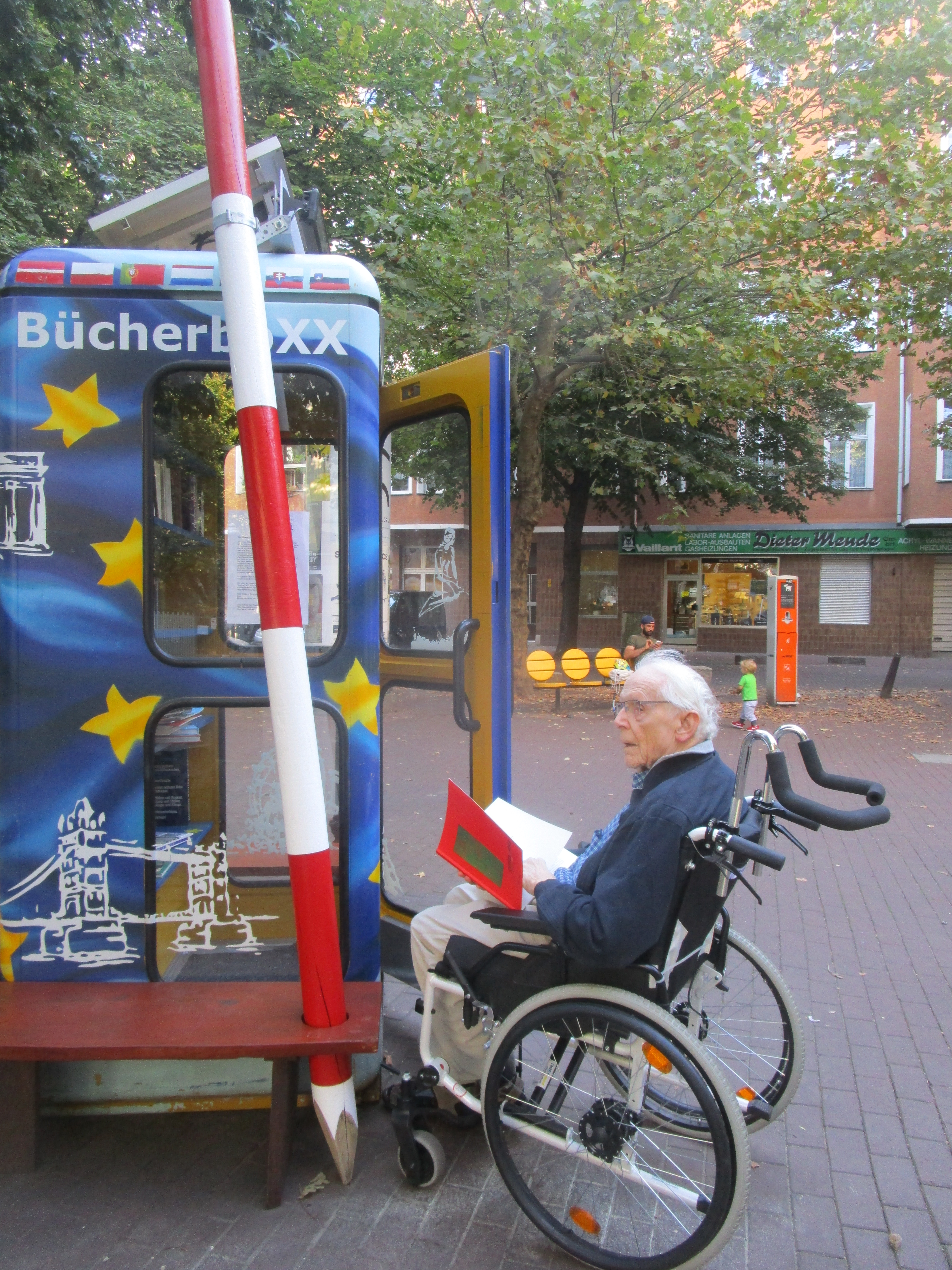 Im Februar 2017 hatten wir ihn noch zu einem Gespräch mit Professor Rauner und einer szenischen Lesung seines Aufsatzes „Feilen bis einem die Hände abfallen“ eingeladen (Foto links oben im Gespräch mit Prof. Rauner). Ausflüge im Rollstuhl führten auch zur nahegelegenen BücherboXX (Foto rechts September 2017), die er als technisch-soziales Gesamtkunstwerk bewunderte. Konrad Kutt