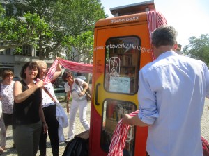 Christoph Wapler, Fraktionsvorsitzender der GRÜNEN in der BVV Charlottenburg-Wilmersdorf, hob die stadtteilbezogene Leistung dieser BücherboXX auf der Nachhaltigen Mierendorff-Insel wie auch der übrigen acht BücherboXXen im Bezirk hervor. Zum Schluss der kleinen Feierstunde hat Helus Herzygier in seiner unnachahmlichen berlinischen Sprachgewalt politische Gedichte von Kurt Tucholsky zum Besten gegeben.