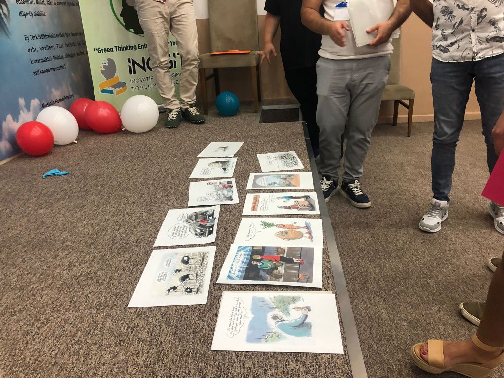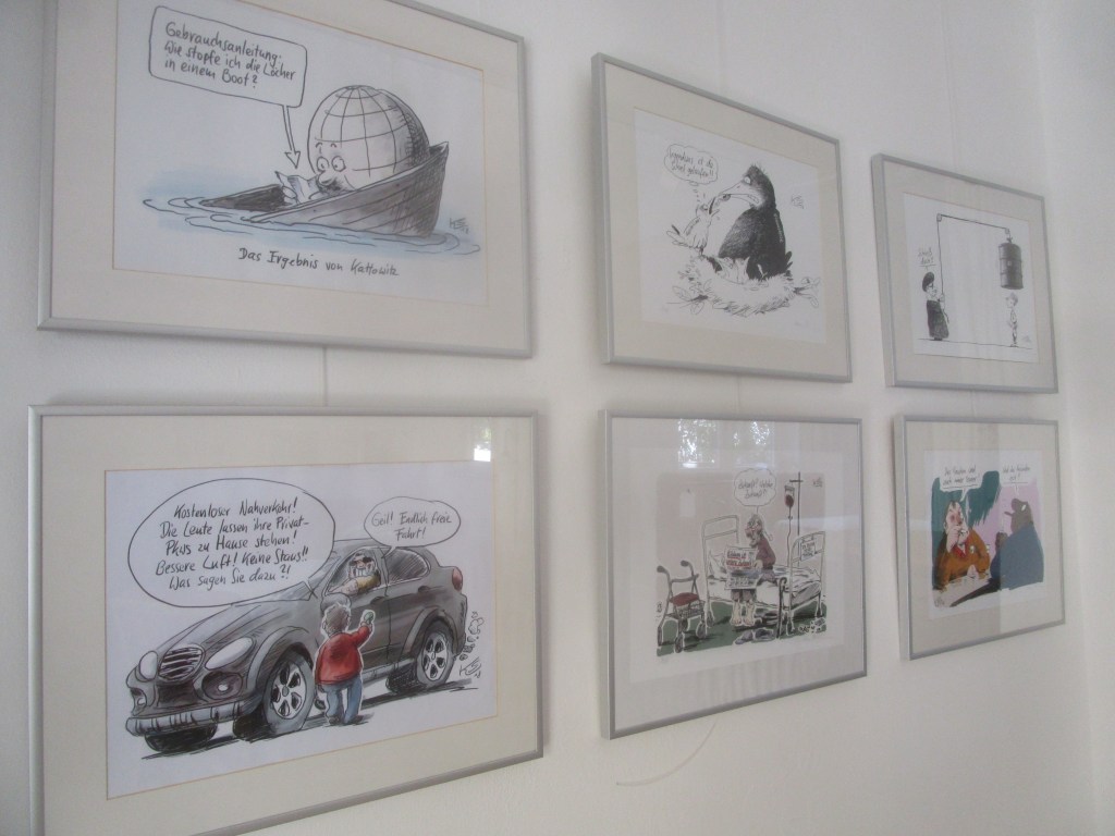 Zum Beispiel wurden auf der Basis einer Ausstellung von Umwelt-Karikaturen von Klaus Stuttmann von den Teilnehmern eigene Bilder entworfen: Hier sind Fotos des Prozesses und vom Ergebnis zu sehen.