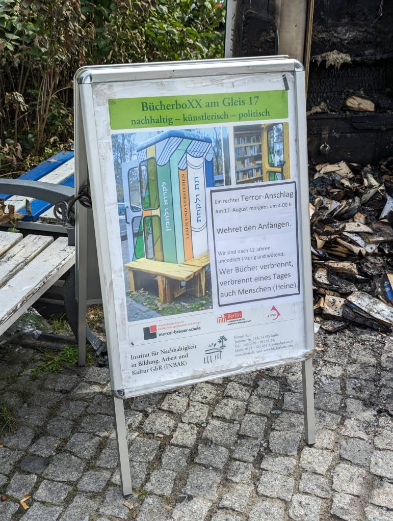 Gespräche, Musik, Literatur sollen helfen, das Geschehene zu verarbeiten und neue Kräfte für die Fortsetzung der vor 12 Jahren begonnenen Arbeit gegenüber vom Mahnmal Gleis 17 zu sammeln. Das Buch, Wissen und Aufklärung bleiben der Mittelpunkt. Antisemitismus und Rassismus dürfen keine Stimme bekommen.